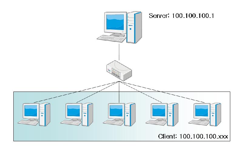 서버에는 100.100.100.1을 할당하고 L2 스위치(또는 허브)에는 리눅스를 설치할 클라이언트를 연결하였다. 이제 서버에 dhcpd와 tftp 서버를 올려서 PXE부팅이 가능하도록 설정하면 된다.