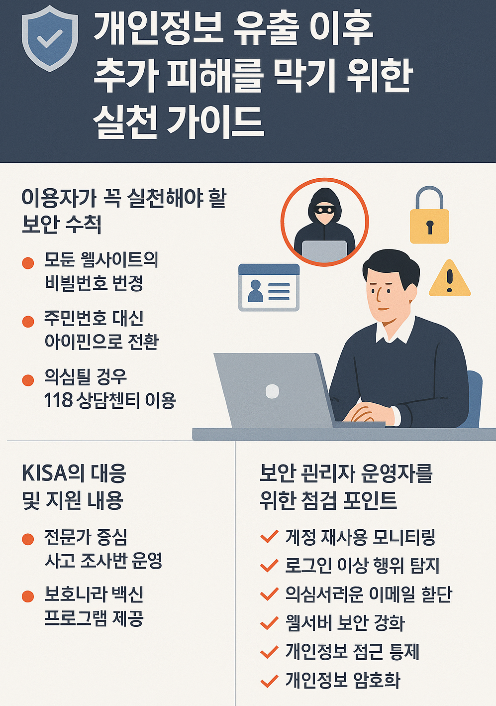 - KISA는 사고 직후 피해자들이 자신의 주민번호가 악용되었는지 확인할 수 있도록 **‘주민번호 노출 확인 시스템’**을 운영 중입니다.