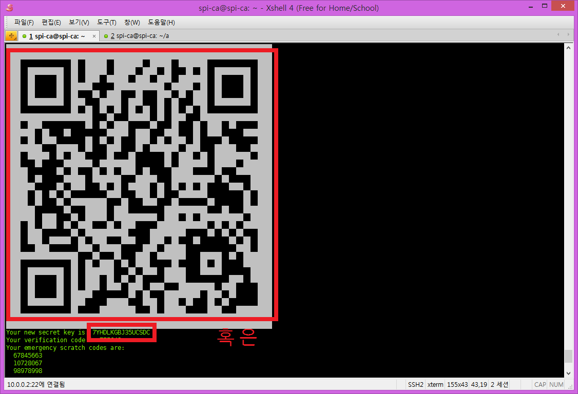 바코드 스캔을 눌러 위의 google-authenticator를 실행결과에서 qr코드를 입력하거나