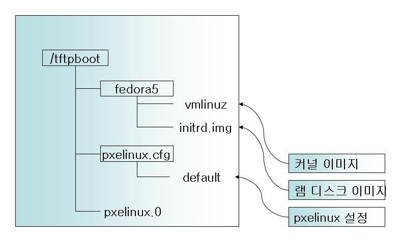 램 디스크 이미지와 커널 이미지는 배포판 시디에 보면 /images/pxeboot/ 디렉토리에 initrd.img와 vmlinuz라는 파일이 있다 이 파일들이 각각 램 디스크 이미지와 커널 이미지이다. 이 파일을 복사하여 /tftpboot/배포판이름/ 에 집어 넣도록 하자.