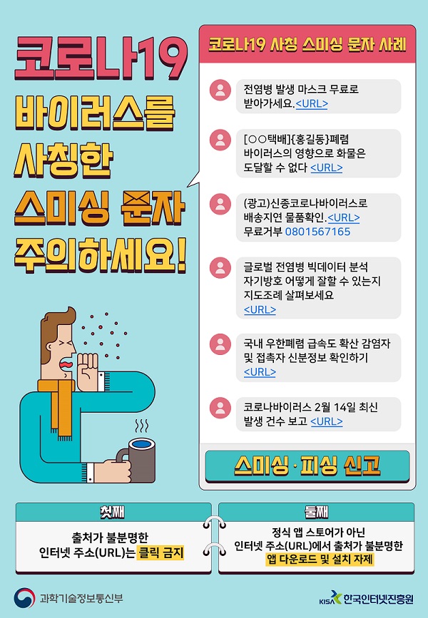 코로나19 바이러스를 사칭한 스미싱 문자 주의하세요!