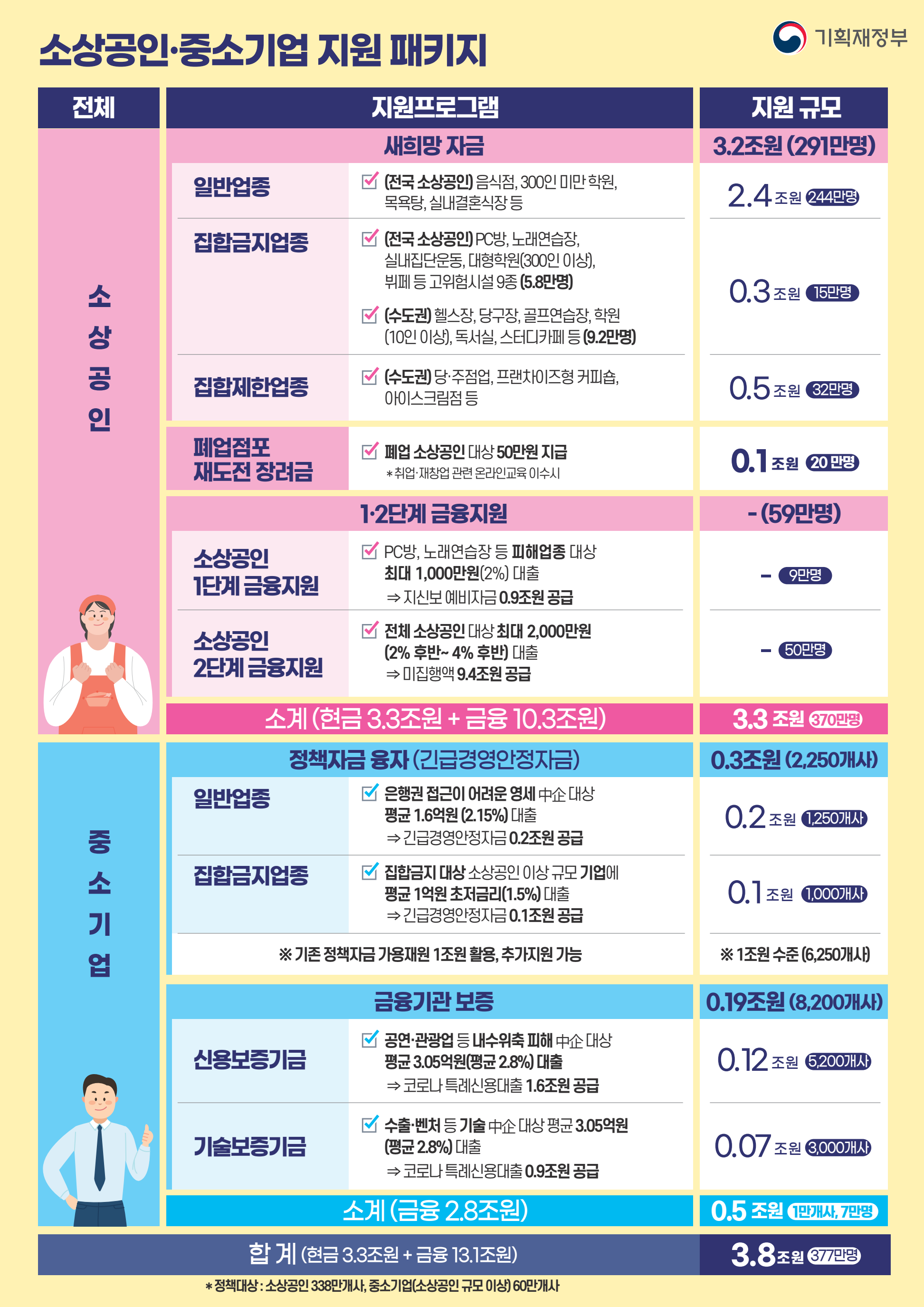 - 집합금지업종 집합금지 대상 소상공인 이상 규모 기업에 평균 1억원 초저금리(1.5%) 대출 => 긴급경영안정자금 0.1조원 공급