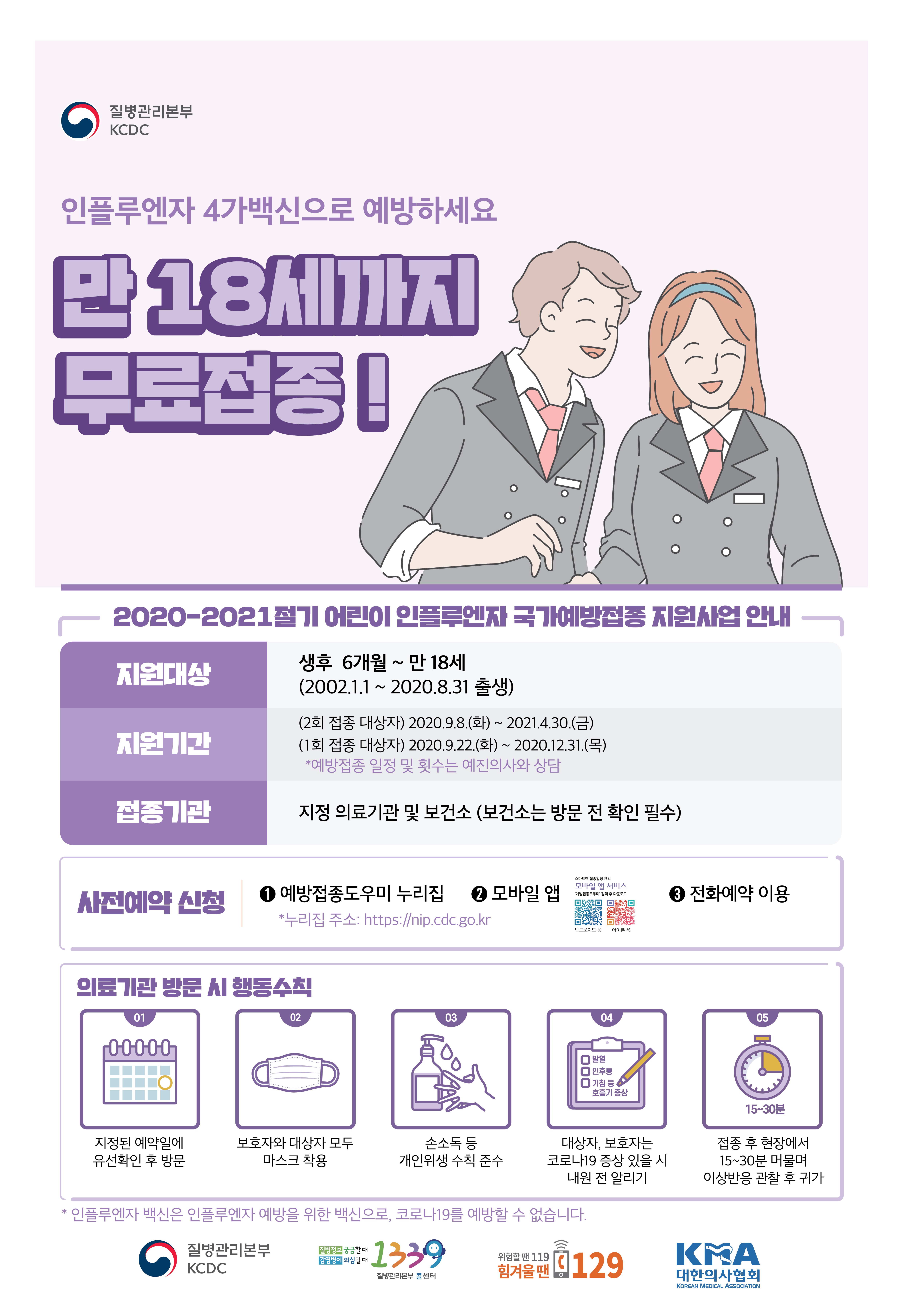 인플루엔자 4가 백신으로 예방하세요. 만 18세까지 무료접종!