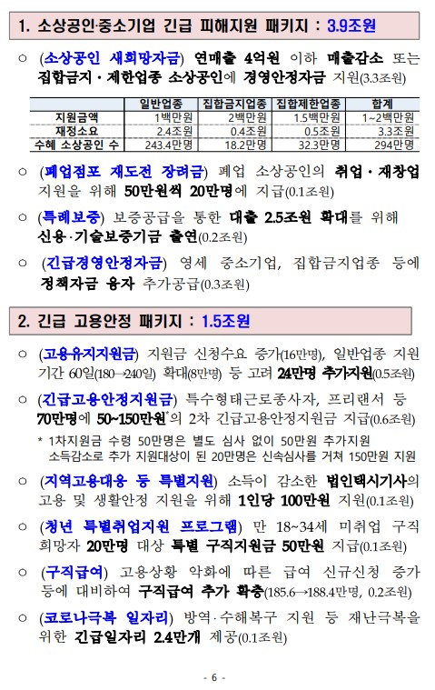 1. 소상공인‧중소기업 긴급 피해지원 패키지 : 3.9조원 |