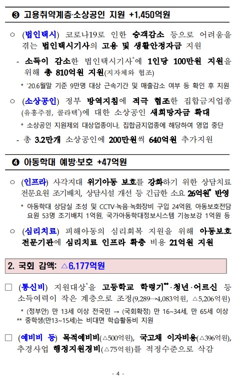 ㅇ (지역고용대응 등 특별지원) 소득이 감소한 법인택시기사의 고용 및 생활안정 지원을 위해 1인당 100만원 지원(0.1조원)