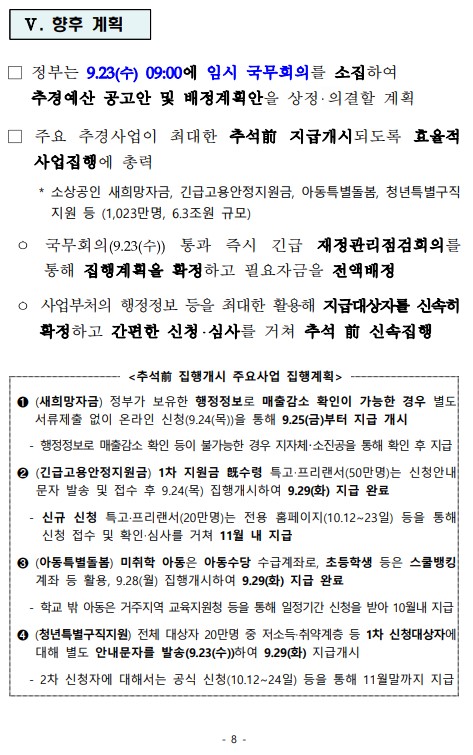 □ 정부는 9.23(수) 09:00에 임시 국무회의를 소집하여 추경예산 공고안 및 배정계획안을 상정‧의결할 계획