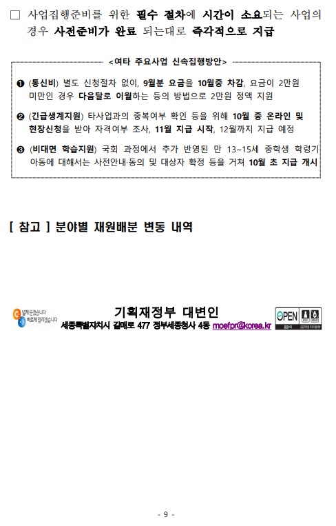 ➊ (통신비) 별도 신청절차 없이, 9월분 요금을 10월중 차감, 요금이 2만원 미만인 경우 다음달로 이월하는 등의 방법으로 2만원 정액 지원 ➋ (긴급생계지원) 타사업과의 중복여부 확인 등을 위해 10월 중 온라인 및 현장신청을 받아 자격여부 조사, 11월 지급 시작, 12월까지 지급 예정 ➌ (비대면 학습지원) 국회 과정에서 추가 반영된 만 13~15세 중학생 학령기 아동에 대해서는 사전안내‧동의 및 대상자 확정 등을 거쳐 10월 초 지급 개시 |
