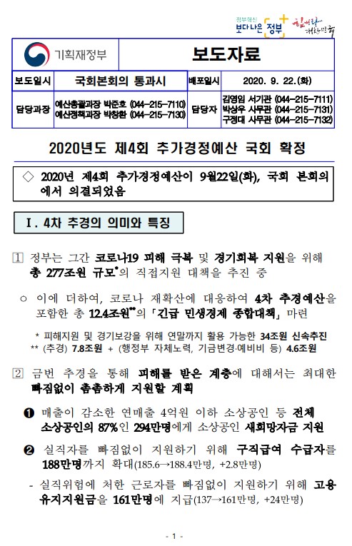 ◇ 2020년 제4회 추가경정예산이 9월22일(화), 국회 본회의에서 의결되었음 |