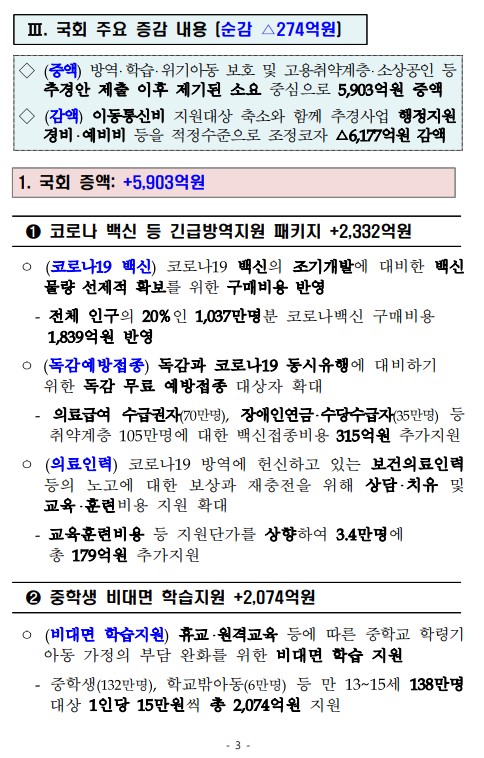 2 금번 추경을 통해 피해를 받은 계층에 대해서는 최대한 빠짐없이 촘촘하게 지원할 계획