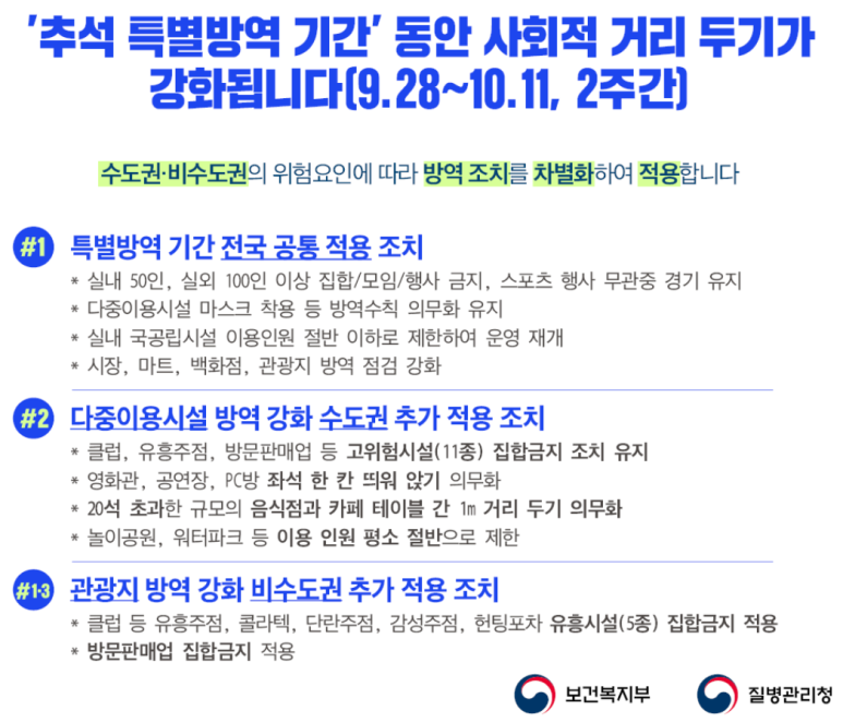 ´추석 특별방역 기간´ 동안 사회적 거리 두기가 강화됩니다(9.28~10.11, 2주간)