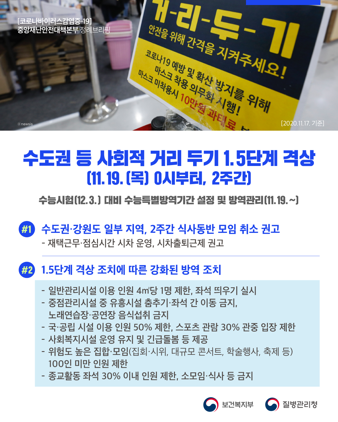 이에 따라 11월 19일(목) 0시부터 12월 2일(수) 자정까지 2주간 수도권 지역의 사회적 거리 두기를 1.5단계로 격상한다.