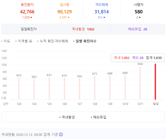 □ 질병관리청 중앙방역대책본부(본부장 : 정은경 청장)는 12월 13일 0시 기준으로, 국내 발생 신규 확진자는 1,002명이 확인되었고, 해외유입 사례는 28명이 확인되어 총 누적 확진자 수는 42,766명(해외유입 4,892명)이라고 밝혔다.