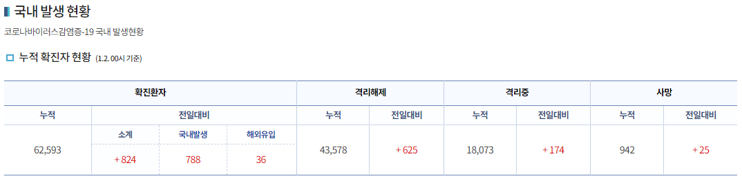 □ 질병관리청 중앙방역대책본부(본부장 : 정은경 청장)는 1월 2일 0시 기준으로, 국내 발생 신규 확진자는 788명이 확인되었고, 해외유입 사례는 36명이 확인되어 총 누적 확진자 수는 62,593명(해외유입 5,446명)이라고 밝혔다.