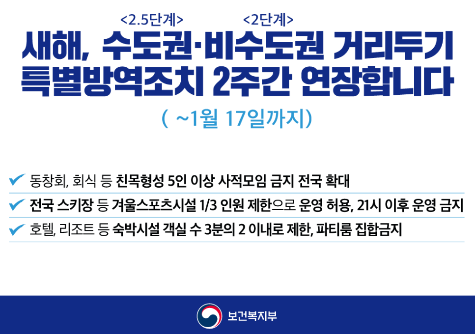 1월3일 종료 예정이었던 수도권 2.5단계, 비수도권 2단계인 현행 신종 코로나바이러스 감염증(코로나19)으로 인한 사회적 거리두기를 1월17일까지 2주 추가로 연장합니다.