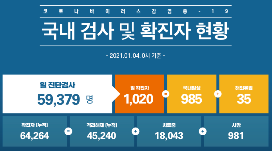 □ 질병관리청 중앙방역대책본부(본부장 : 정은경 청장)는 1월 4일 0시 기준으로, 국내 발생 신규 확진자는 985명이 확인되었고, 해외유입 사례는 35명이 확인되어 총 누적 확진자 수는 64,264명(해외유입 5,497명)이라고 밝혔다.
