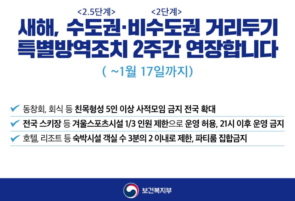 - 사람간 접촉을 최소화하기 위해 연말연시 특별대책 핵심조치를 포함하여 수도권 2.5단계, 비수도권 2단계 사회적 거리두기 조치를 오늘부터 2주간(‘21.1.1∼1.17) 시행한다.