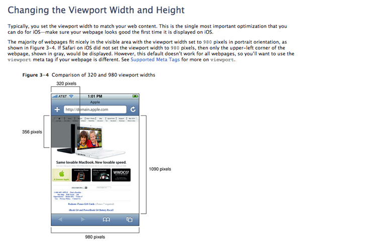 이런 문제를 가장 먼저 깨닫고 해결을 시도한 것이 애플이며, 애플은 최초로 스마트폰에 제대로 된 웹 환경을 제공했습니다. 당시에는 지금처럼 사이트를 모바일용으로 만들지 않았고 웹 페이지 기준이었기 때문에 가상 viewport 개념을 도입했습니다. 실제로는 320px인 디스플레이를 980px의 viewport에 그린 것입니다. 아래 그림은 이해를 돕기 위한 것으로, 애플 개발자 사이트에서 viewport 부분을 캡처한 화면입니다. 320px에서는 다 보이지 않는 페이지들이 980px의 viewport에서는 보이도록 브라우저가 작동하는 것을 볼 수 있습니다.