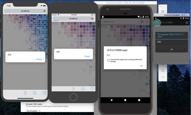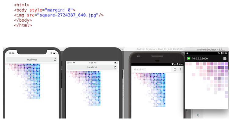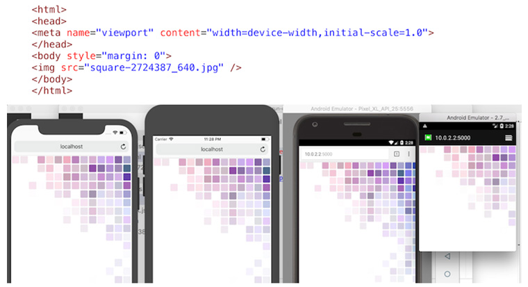 이해를 돕기 위해 가로 640px, 세로 640px의 이미지를 렌더링 하는 코드를 여러 장비에서 확인해 보겠습니다. 사용된 시뮬레이터(아래 이미지)는 왼쪽부터 iPhone X 와 iPhone 6, 그리고 Pixel2 XL와 저해상도 안드로이드 장비입니다.
