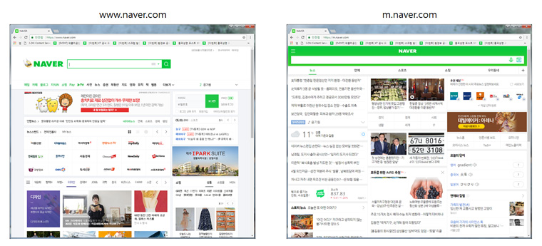 예를 들어, 모바일에서 네이버에 접속할 때를 생각해 보면 쉽게 이해할 수 있습니다. 주소창에“www.naver.com”라고 입력해도 모바일 브라우저로 접근하면 “m.naver.com”로 전환되고, 렌더링 하는 리소스들도 전혀 다릅니다. “www.naver.com”의 경우, 크기를 늘였다 줄였다 해도 레이아웃이 전혀 변경되지 않죠.
