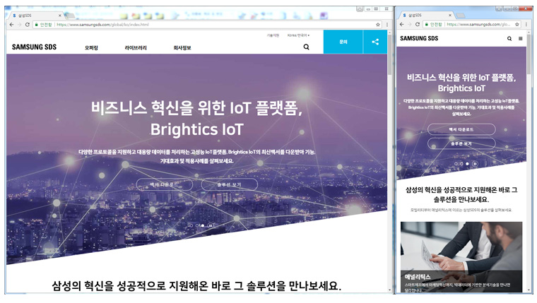 반면에 반응형 웹은 같은 페이지 리소스를 가져와도 해당 페이지의 크기에 따라서 다르게 보입니다. 삼성SDS 사이트가 해당되는데, 브라우저의 사이즈를 줄이면 레이아웃 자체가 바뀝니다.