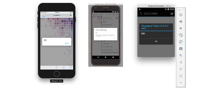 이해를 돕기 위해 가로 640px, 세로 640px의 이미지를 렌더링 하는 코드를 여러 장비에서 확인해 보겠습니다. 사용된 시뮬레이터(아래 이미지)는 왼쪽부터 iPhone X 와 iPhone 6, 그리고 Pixel2 XL와 저해상도 안드로이드 장비입니다.