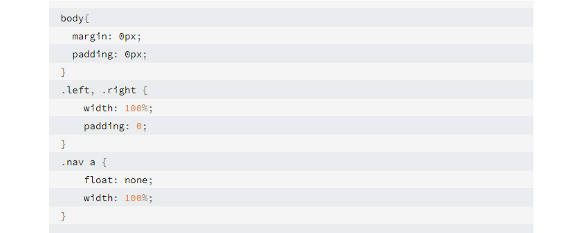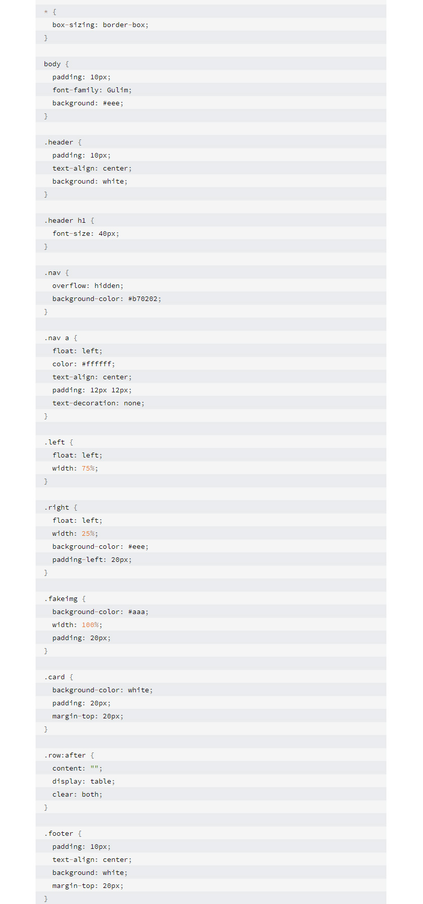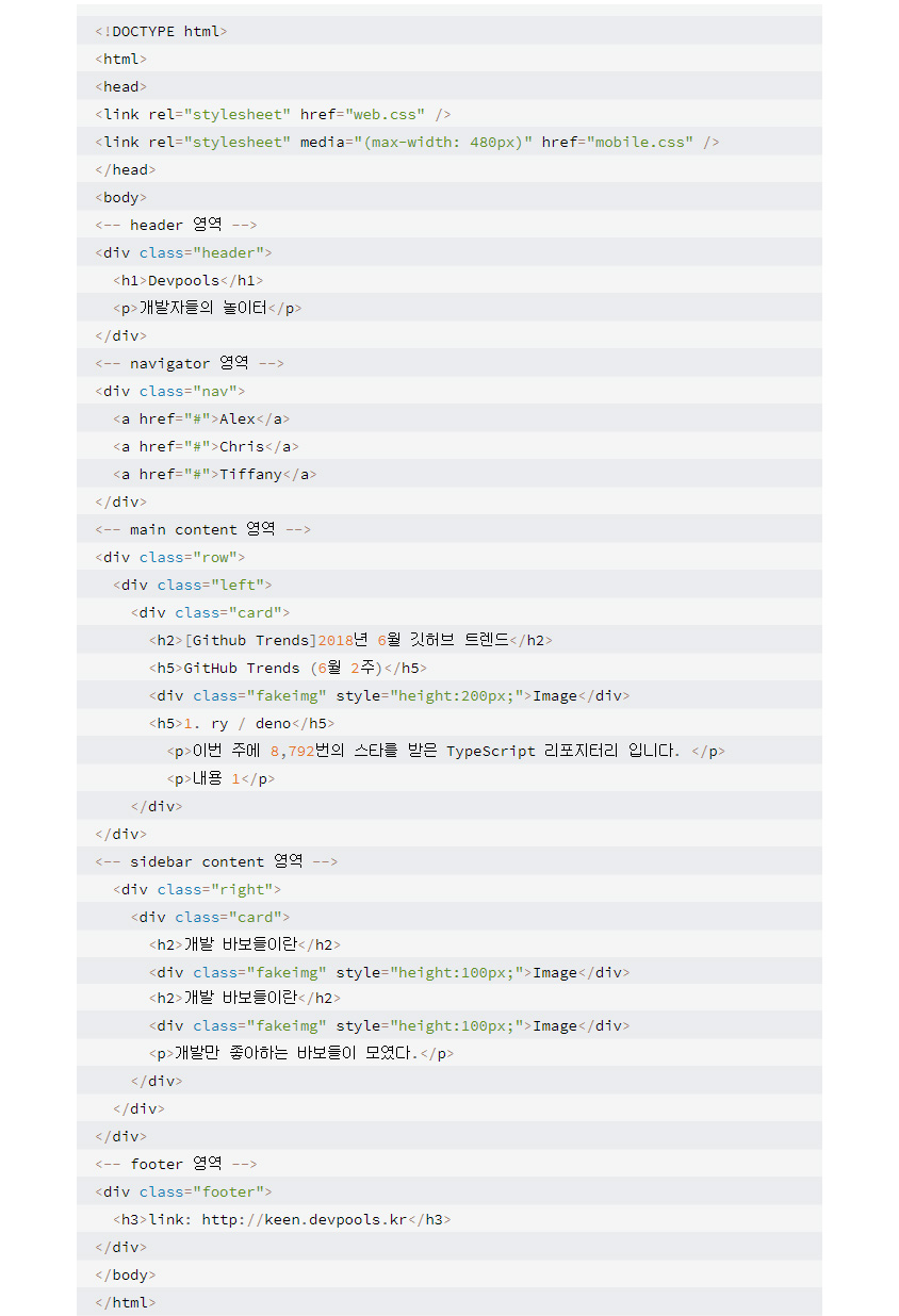 모바일에서는 웹에 존재했던 여백(padding)이 사라지고 레이아웃 자체가 일렬로 정리된 것을 볼 수 있습니다. 사이즈가 줄어들면서 레이아웃이 바뀐 것이죠. mobile.css의 소스코드는 다음과 같습니다.