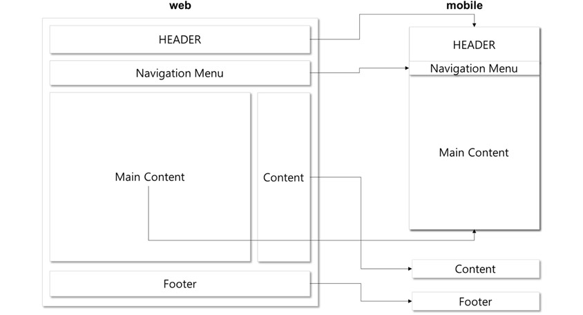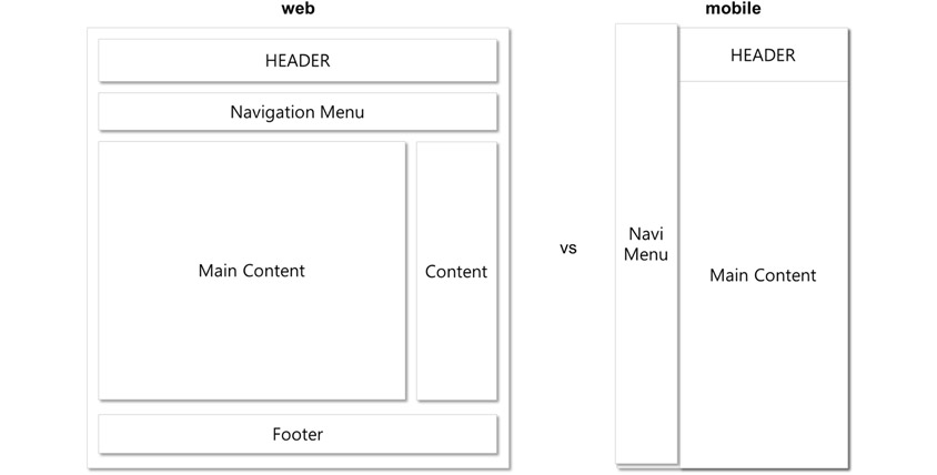 물론 레이아웃은 매우 다양하므로 위의 두 화면 만으로 모든 것을 이야기할 수는 없습니다. 하지만 웹 레이아웃의 메인 콘텐츠와 모바일 페이지 사이에는 정보 제공력(보여줄 수 있는 정보의 양)의 차이가 분명히 존재합니다. 그래서 모바일 레이아웃에서는 내비게이션 메뉴를 숨겼다가 나타내기도 하고, 푸터 영역도 보이지 않다가 스크롤이 멈추면 나타나게 하는 등의 방법으로 어려움을 해결하기도 하죠.