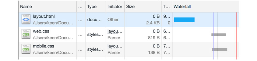 여기서 중점적으로 봐야 할 부분은 장치에 따라 CSS를 다르게 참조하도록 한 점입니다. 페이지를 로딩하면서 CSS를 미리 가져와 파싱하는 것은 일반적으로 HTML에서 가져오는 것과 같습니다. (web.css와 mobile.css를 한꺼번에 가져와 파싱하는 것. 아래 [그림5] 참조.)