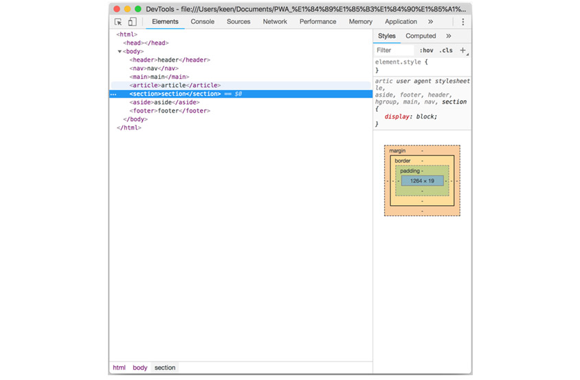 CSS(Casading Style Sheet)는 따로 공부하지 않아도 더 어려운 알고리즘을 소화할 수 있기 때문에 많은 개발자들이 어려워하지 않는 영역입니다. 일반적으로 HTML 요소의 스타일 정의가 가장 큰 역할인데, 같은 요소에 대해서는 가장 마지막에 기술한 스타일이 이전 스타일을 대신한다는 특징이 있죠. HTML5에서 정의한 header나 aside 같은 시맨틱 태그조차도 스타일 없이는 div와 같이 보입니다. 예를 들어, 아래 [그림1]을 보면 크롬에서 브라우저의 기본 display 속성이 block을 표시합니다.