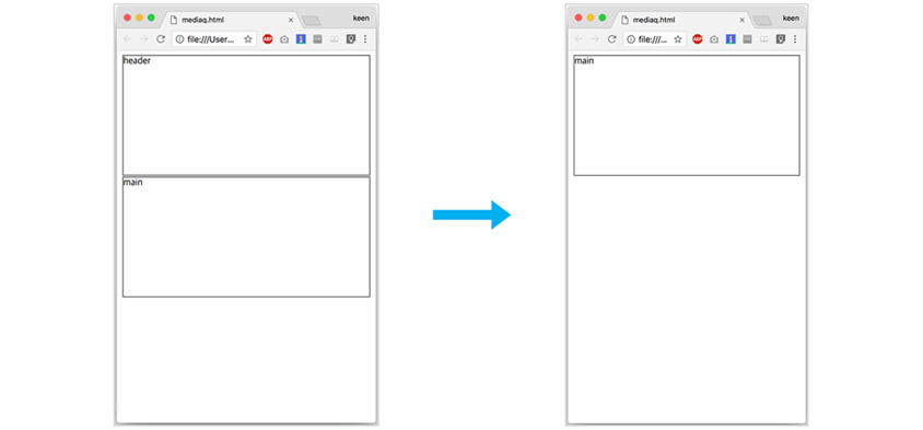 이렇게 적용한 후 브라우저 사이즈를 400px 근처에서 왔다 갔다 해 보면, 400px 이하에서는 [그림3]과 같이 header 클래스의 div 오브젝트가 사라지는 것을 볼 수 있습니다.