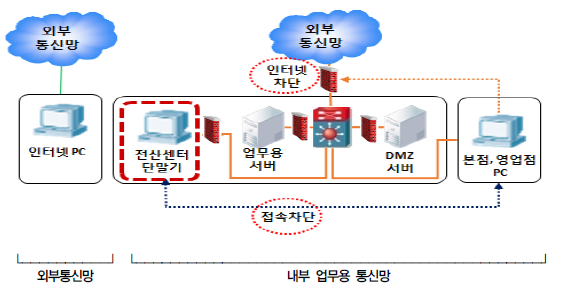 - 내부통신망과 연결된 내부 업무용시스템은 인터넷(무선통신망 포함) 등 외부통신망과 분리・차단 및 접속 금지(단, 업무상 불가피하여 금융감독원장의 확인을 받은 경우에는 그러하지 아니하다)
