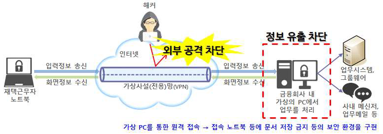 ➋ 외부 원격 접속을 통한 재택근무시 내부통제절차를 거쳐 가상사설망(VPN)* 활용 등 보안대책을 적용토록 함으로써 해킹·정보유출 등의 위험은 방지
