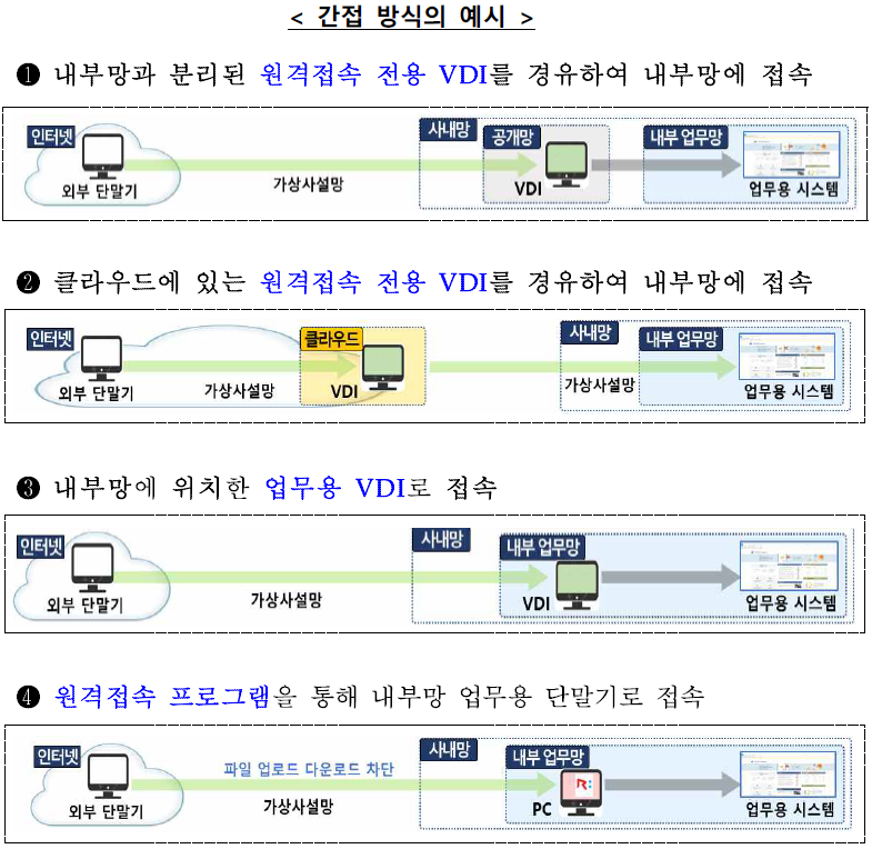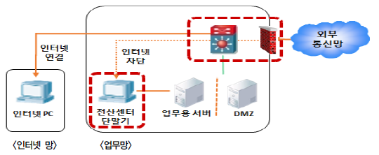 - 전산센터 단말기를 내・외부망과의 연결구간이 각각 차단된 VDI로 구성하고, 내부망과 차단된 단말기로 위 VDI에 접속하더라도 내・외부망과는 여전히 차단되어 망분리 예외규정에 해당함