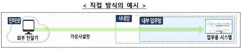 □ 간접 접속 방식 : 외부 단말기가 업무용 단말기를 경유하여 내부망에 접속하는 것으로 외부 단말기는 업무용 단말기의 입력 및 화면 출력만 처리하고 업무용 단말기와 파일 송수신이 차단되어야 하며, 내부망 연결시 인터넷 연결을 차단하여야 함