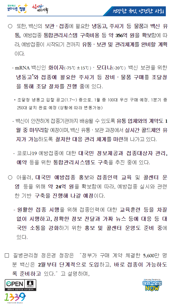 - 백신이 안전하게 접종기관까지 배송될 수 있도록 유통 업체와의 계약도 1월 중 마무리할 예정이며, 백신 유통·보관 과정에서 실시간 콜드체인 유지가 가능하도록 철저한 대응 관리 체계를 마련해 나가고 있다.