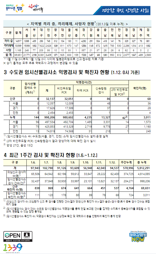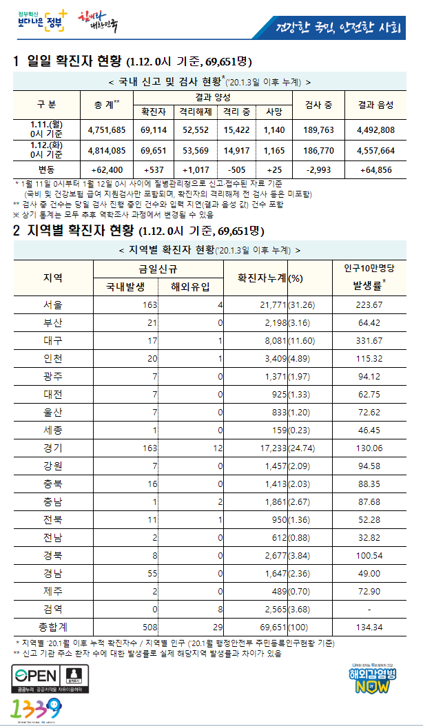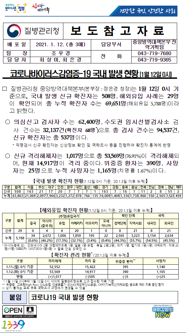 □ 질병관리청 중앙방역대책본부(본부장 : 정은경 청장)는 1월 12일 0시 기준으로, 국내 발생 신규 확진자는 508명, 해외유입 사례는 29명이 확인되어 총 누적 확진자 수는 69,651명(해외유입 5,788명)이라고 밝혔다.