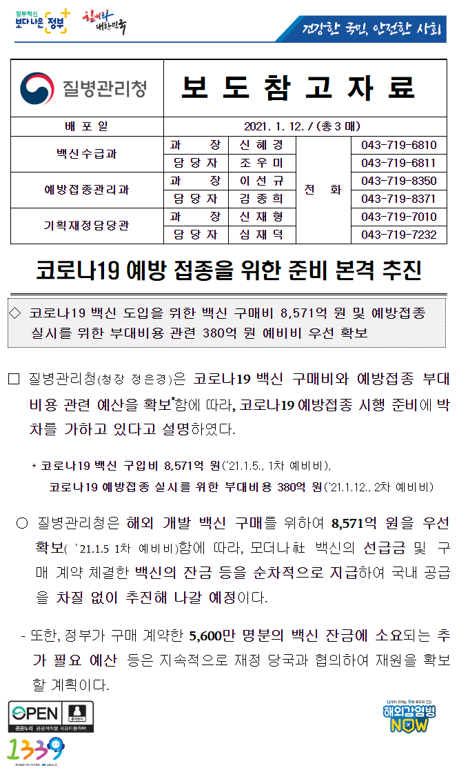 코로나19 예방접종 실시를 위한 부대비용 380억 원(’21.1.12., 2차 예비비)
