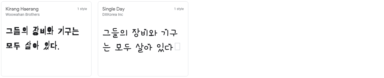 <link href="https://fonts.googleapis.com/css2?family=Black+And+White+Picture&family=Black+Han+Sans&family=Cute+Font&family=Do+Hyeon&family=Dokdo&family=East+Sea+Dokdo&family=Gaegu&family=Gamja+Flower&family=Gothic+A1&family=Gugi&family=Hi+Melody&family=Jua&family=Kirang+Haerang&family=Nanum+Brush+Script&family=Nanum+Gothic&family=Nanum+Gothic+Coding&family=Nanum+Myeongjo&family=Nanum+Pen+Script&family=Noto+Sans+KR&family=Noto+Serif+KR&family=Poor+Story&family=Single+Day&family=Song+Myung&family=Stylish&family=Sunflower:wght@300&family=Yeon+Sung&display=swap" rel="stylesheet">
