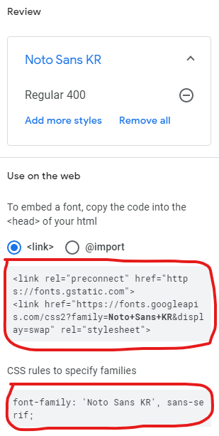 5. 우측 "Selected family" Review 박스 하단 <link> 태그를 복사해서 홈페이지 <head> 태그 안에 붙여넣기