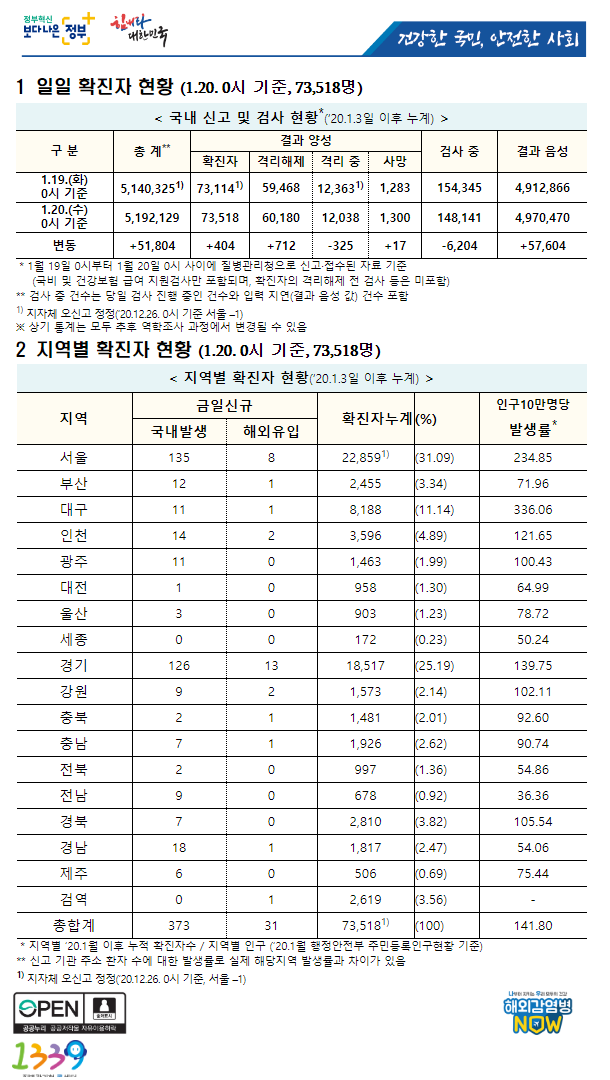 오늘(1.20 00시 기준) 누적 확진환자 73,518명, 격리해제 60,180명, 격리중 12,038명, 사망 1,300명입니다.