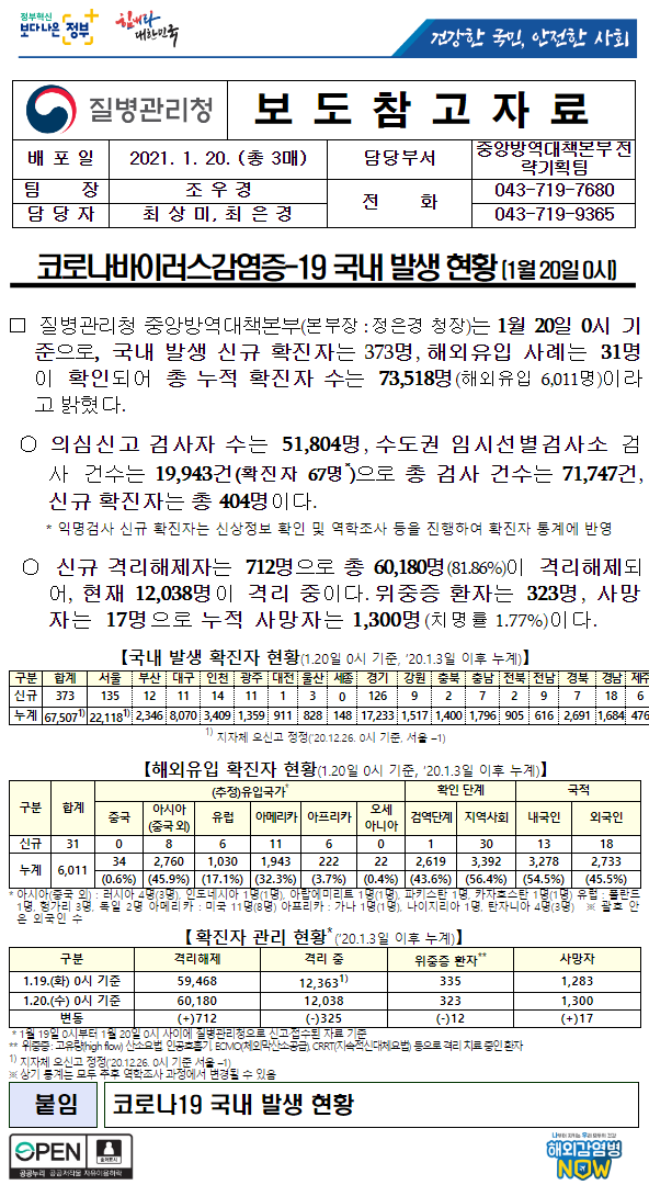 □ 질병관리청 중앙방역대책본부(본부장 : 정은경 청장)는 1월 20일 0시 기준으로, 국내 발생 신규 확진자는 373명, 해외유입 사례는 31명이 확인되어 총 누적 확진자 수는 73,518명(해외유입 6,011명)이라고 밝혔다.