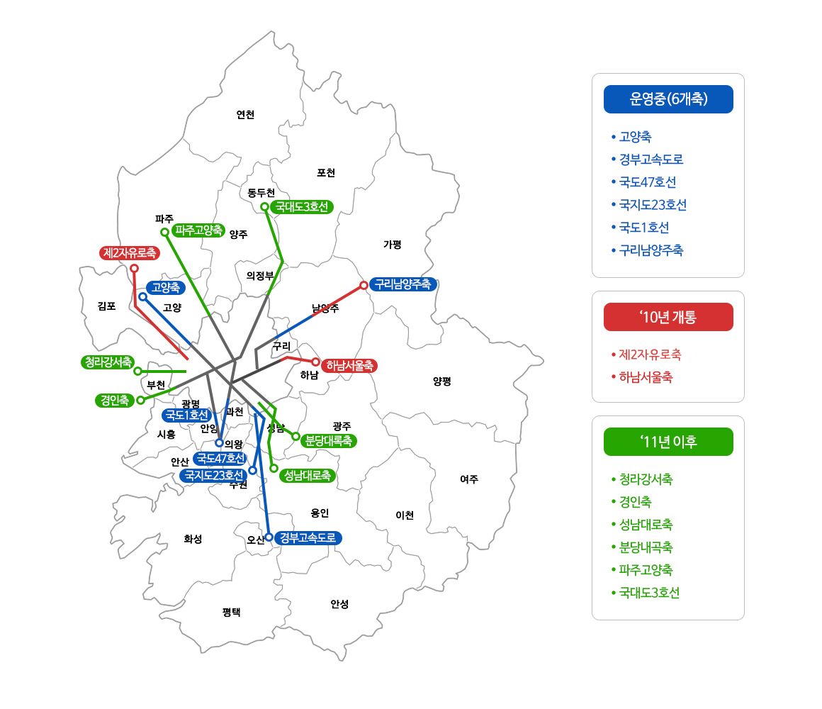 | 통일로축 | 파주~고양~서울(구파발역) | 16.6 | 1구간 : 4.0㎞ 공사중(’10.9월 착공) 2구간 : 12.6㎞ 계획중 |