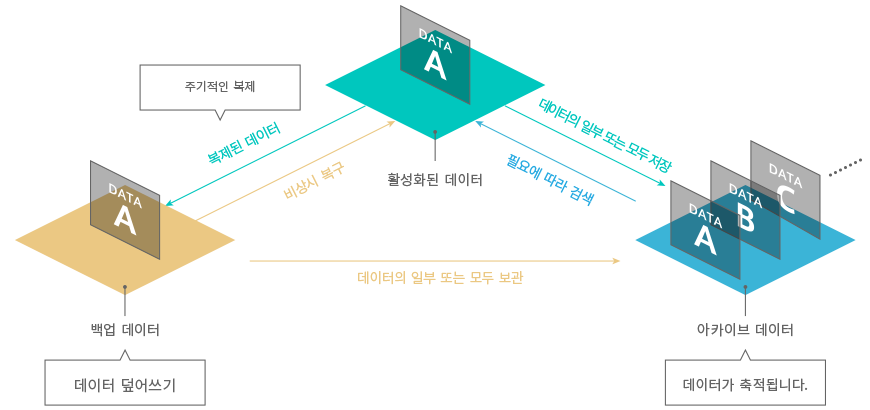 | 데이터가 손실(삭제)되거나 손상된 경우 데이터를 복원(Restore) (특정시점의 데이터 저장) | 목적(용도) | 안전하고 장기적인 스토리지 및 방대한 양의 데이터를 회수(Retrieval)-재사용 (정보, 지식 등 분류된 데이터 모음) |