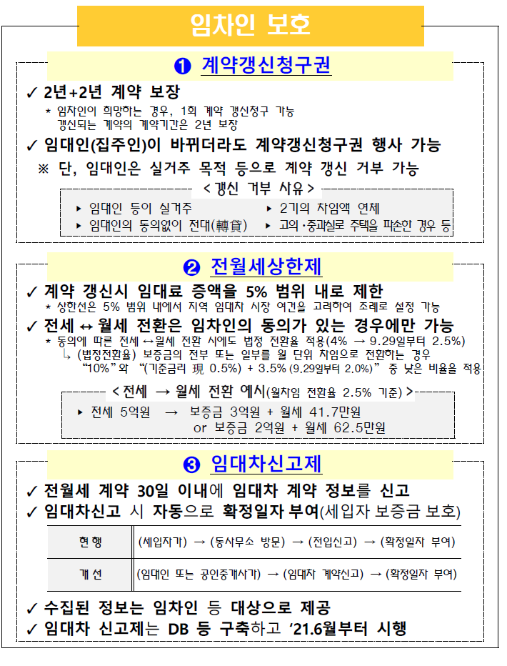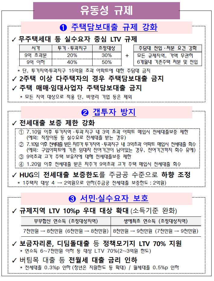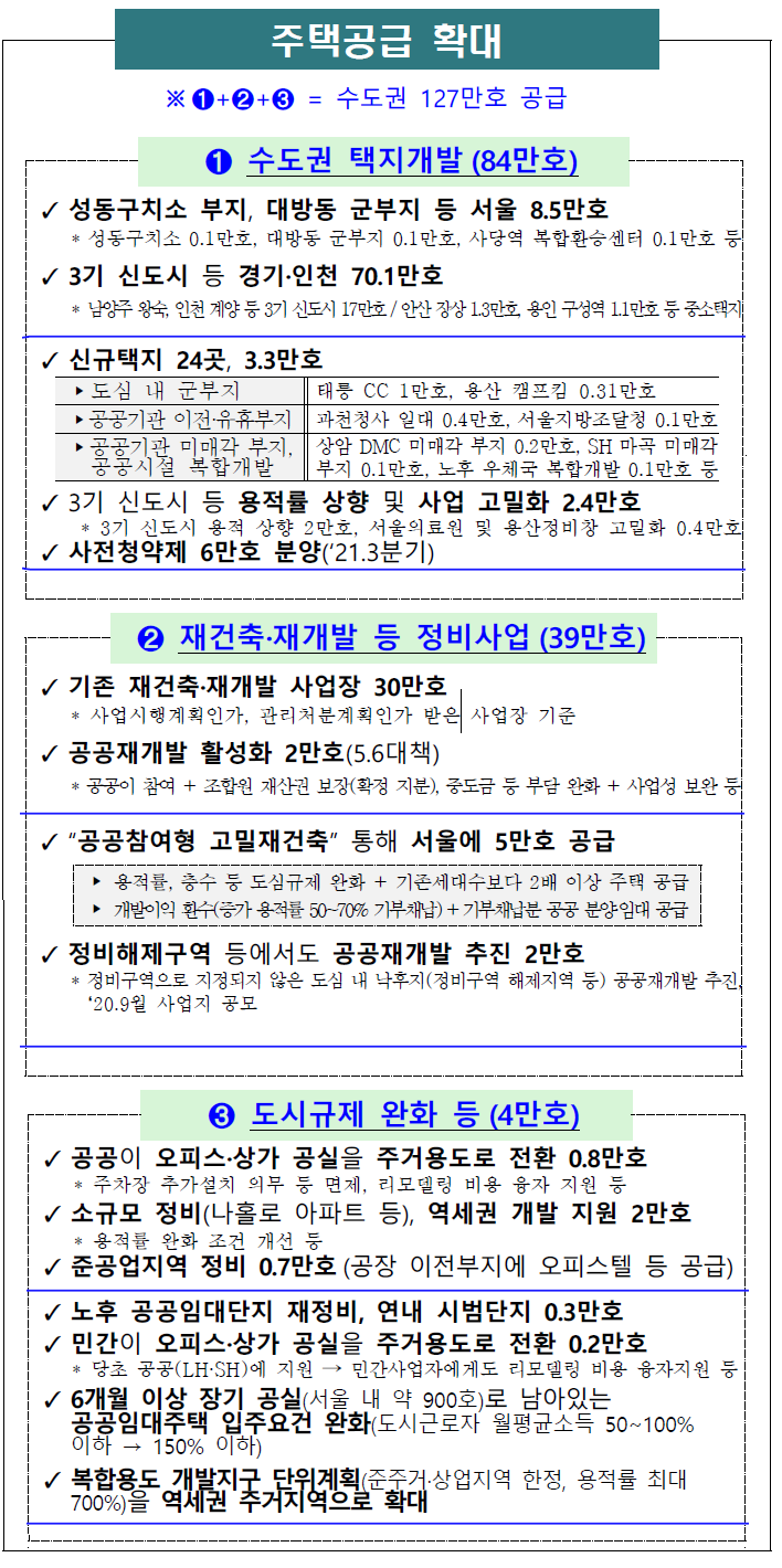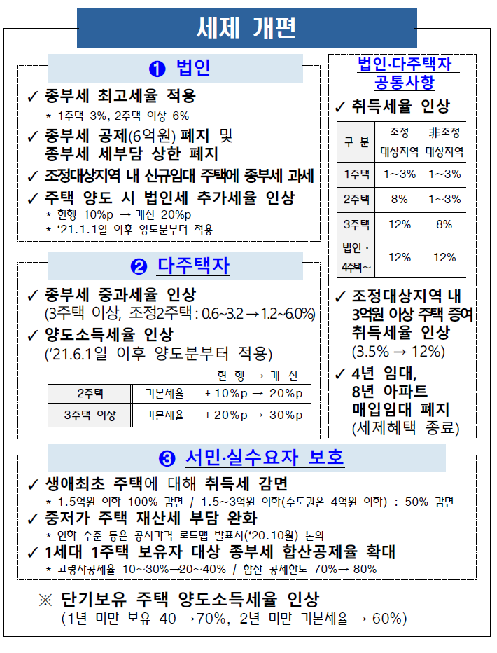 | 투기수요 근절과 실수요자 보호를 위한 부동산시장 수급 안정 방안 유동성 규제 세제 개편 임차인 보호 ➊ 주택담보대출 규제 강화 ✓ 무주택세대 등 실수요자 중심 LTV 규제 시가 투기·투과지구 조정대상 + 주담대 전입·처분 요건 강화 9억 초과분 20% 30% 모든 규제지역, 가액 무관히 9억 이하 40% 50% 6개월내 기존주택 처분 및 전입 * 단, 투기지역‧투과지구 15억원 초과 아파트에 대한 주담대 금지 ✓ 2주택 이상 다주택자의 경우 주택담보대출 금지 ✓ 주택 매매·임대사업자 주택담보대출 금지 * 모든 지역 대상으로 적용 단, 비영리 기업 등은 제외 ➋ 갭투자 방지 ✓ 전세대출 보증 제한 강화 ➀ 7.10일 이후 투기지역·투과 지구 내 3억 초과 아파트 매입시 전세대출보증 제한 (예외: 직장이동 등 실수요로 전세대출 받는 경우) ➁ 7.10일 이후 전세대출 받은 차주가 투기지역·투과지구 내 3억초과 아파트 매입시 전세대출 회수 (예외: 구입아파트에 기존 임대차 잔여기간이 남아있는 경우, 잔여기간까지 회수 유예) ➂ 9억초과 고가 주택 보유자에 대해 전세대출보증 제한 ➃ 1.20일 이후 전세대출 받은 차주가 9억초과 고가 주택 매입시 전세대출 회수 ✓ HUG의 전세대출 보증한도를 주금공 수준으로 하향 조정 * 1주택자 대상 4 → 2억원으로 인하(주금공 전세대출 보증한도 : 2억원) ➌ 서민·실수요자 보호 ✓ 규제지역 LTV 10%p 우대 대상 확대 (소득기준 완화) 부부합산 연소득 (조정대상지역) 생애최초 연소득 (조정대상지역) 7천만원 → 8천만원 (6천만원 → 8천만원) 8천만원 → 9천만원 (7천만원 → 9천만원) ✓ 보금자리론, 디딤돌대출 등 정책모기지 LTV 70% 지원 * 연소득 6~7천만원 이하 등 대상 LTV 70%(2~3억원 한도) ✓ 버팀목 대출 등 전월세 대출 금리 인하 * 전세대출 0.3%p 인하 (청년은 지원한도 등 확대) / 월세대출 0.5%p 인하 ➊ 법인 법인·다주택자 공통사항 ✓ 취득세율 인상 구 분 조정 대상지역 非조정 대상지역 1주택 1~3% 1~3% 2주택 8% 1~3% 3주택 12% 8% 법인· 4주택~ 12% 12% ✓ 조정대상지역 내 3억원 이상 주택 증여 취득세율 인상 (3.5% → 12%) ✓ 4년 임대, 8년 아파트 매입임대 폐지 (세제혜택 종료) ✓ 종부세 최고세율 적용 * 1주택 3%, 2주택 이상 6% ✓ 종부세 공제(6억원) 폐지 및 종부세 세부담 상한 폐지 ✓ 조정대상지역 내 신규임대 주택에 종부세 과세 ✓ 주택 양도 시 법인세 추가세율 인상 * 현행 10%p → 개선 20%p * ‘21.1.1일 이후 양도분부터 적용 ➋ 다주택자 ✓ 종부세 중과세율 인상 (3주택 이상, 조정2주택: 0.6~3.2→1.2~6.0%) ✓ 양도소득세율 인상 (‘21.6.1일 이후 양도분부터 적용) 현 행 → 개 선 2주택 기본세율 + 10%p → 20%p 3주택 이상 기본세율 + 20%p → 30%p ➌ 서민·실수요자 보호 ✓ 생애최초 주택에 대해 취득세 감면 * 1.5억원 이하 100% 감면 / 1.5~3억원 이하(수도권은 4억원 이하) : 50% 감면 ✓ 중저가 주택 재산세 부담 완화 * 인하 수준 등은 공시가격 로드맵 발표시(‘20.10월) 논의 ✓ 1세대 1주택 보유자 대상 종부세 합산공제율 확대 * 고령자공제율 10~30%→20~40% / 합산 공제한도 70%→ 80% ※ 단기보유 주택 양도소득세율 인상 (1년 미만 보유 40 → 70%, 2년 미만 기본세율 → 60%) ➊ 계약갱신청구권 ✓ 2년+2년 계약 보장 * 임차인이 희망하는 경우, 1회 계약 갱신청구 가능 갱신되는 계약의 계약기간은 2년 보장 ✓ 임대인(집주인)이 바뀌더라도 계약갱신청구권 행사 가능 ※ 단, 임대인은 실거주 목적 등으로 계약 갱신 거부 가능 < 갱신 거부 사유 > ▸ 임대인 등이 실거주 ▸ 2기의 차임액 연체 ▸ 임대인의 동의없이 전대(轉貸) ▸ 고의·중과실로 주택을 파손한 경우 등 ➋ 전월세상한제 ✓ 계약 갱신시 임대료 증액을 5% 범위 내로 제한 * 상한선은 5% 범위 내에서 지역 임대차 시장 여건을 고려하여 조례로 설정 가능 ✓ 전세 ↔ 월세 전환은 임차인의 동의가 있는 경우에만 가능 * 동의에 따른 전세 ↔ 월세 전환 시에도 법정 전환율 적용(4% → 9.29일부터 2.5%) ↳ (법정전환율) 보증금의 전부 또는 일부를 월 단위 차임으로 전환하는 경우 “10%”와 “(기준금리 現 0.5%) + 3.5% (9.29일부터 2.0%)” 중 낮은 비율을 적용 < 전세 → 월세 전환 예시(월차임 전환율 2.5% 기준) > ▸ 전세 5억원 → 보증금 3억원 + 월세 41.7만원 or 보증금 2억원 + 월세 62.5만원 ➌ 임대차신고제 ✓ 전월세 계약 30일 이내에 임대차 계약 정보를 신고 ✓ 임대차신고 시 자동으로 확정일자 부여(세입자 보증금 보호) 현 행 (세입자가) → (동사무소 방문) → (전입신고) → (확정일자 부여) 개 선 (임대인 또는 공인중개사가) → (임대차 계약신고) → (확정일자 부여) ✓ 수집된 정보는 임차인 등 대상으로 제공 ✓ 임대차 신고제는 DB 등 구축하고 ‘21.6월부터 시행 주택공급 확대 ※ ➊+➋+➌ = 수도권 127만호 공급 ➊ 수도권 택지개발 (84만호) ➋ 재건축·재개발 등 정비사업 (39만호) ➌ 도시규제 완화 등 (4만호) ✓ 성동구치소 부지, 대방동 군부지 등 서울 8.5만호 * 성동구치소 0.1만호, 대방동 군부지 0.1만호, 사당역 복합환승센터 0.1만호 등 ✓ 3기 신도시 등 경기·인천 70.1만호 * 남양주 왕숙, 인천 계양 등 3기 신도시 17만호 / 안산 장상 1.3만호, 용인 구성역 1.1만호 등 중소택지 ✓ 기