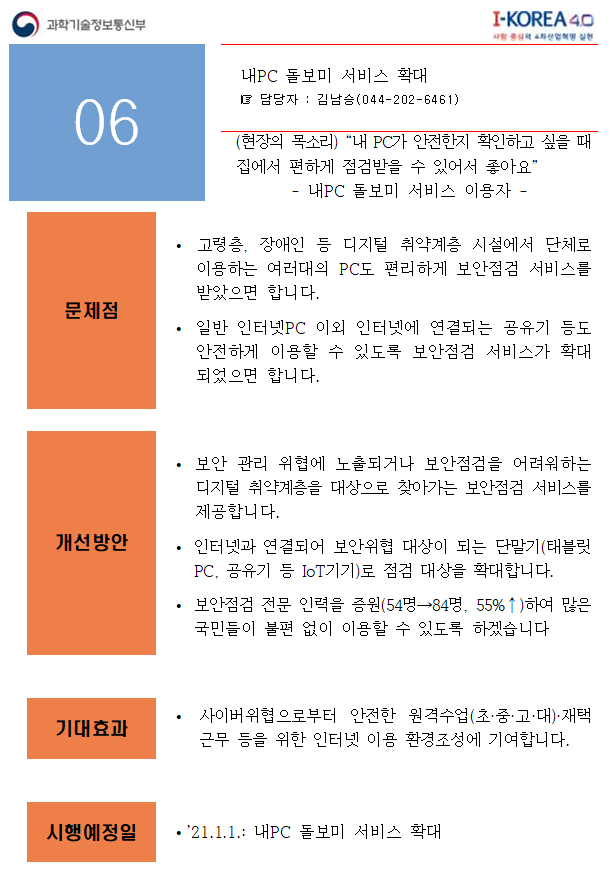 o 정부는 지난해 9월부터 디지털 뉴딜의 K-사이버방역 구축의 일환으로 전국민 인터넷PC를 대상으로 보안전문가가 원격에서 무료로 보안점검 해주는『내 PC 돌보미 서비스*』실시(’20.9월)하고 있다.
