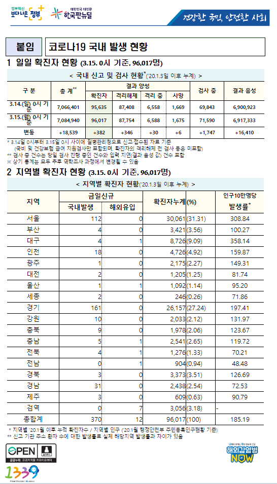 □ 질병관리청 중앙방역대책본부(본부장 : 정은경 청장)는 3월 15일 0시 기준으로, 국내 발생 신규 확진자는 370명, 해외유입 사례는 12명이 확인되어 총 누적 확진자 수는 96,017명(해외유입 7,318명)이라고 밝혔다.