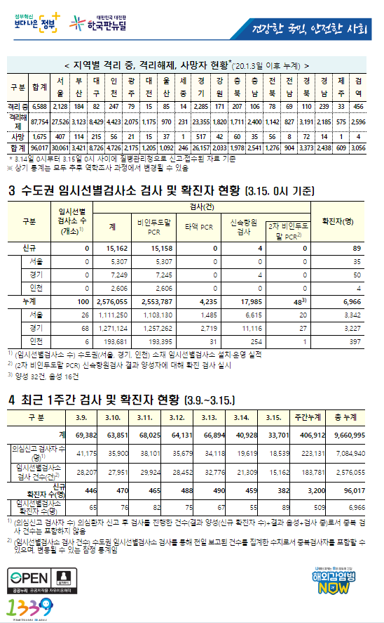 * 3.14일 0시부터 3.15일 0시 사이에 질병관리청으로 신고·접수된 자료 기준 ** 위중증 : 고유량(high flow) 산소요법, 인공호흡기, ECMO(체외막산소공급), CRRT(지속적신대체요법) 등으로 격리 치료 중인 환자 ※ 상기 통계는 모두 추후 역학조사 과정에서 변경될 수 있음 |
