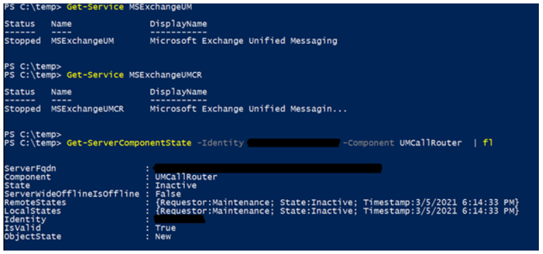 | Get-Service MSExchangeUM Get-Service MSExchangeUMCR Get-ServerComponentState –Identity “ComputerName” -Component UMCallRouter | fl |
