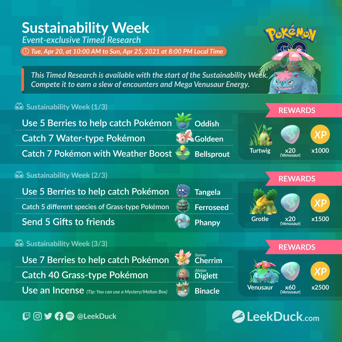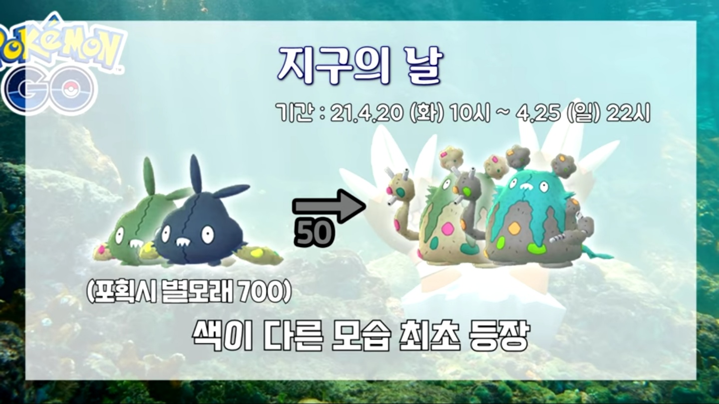 “지구의 날 캠페인”에 참가하여 다양한 목표를 달성해서 캠페인의 참가 상황에 따른 게임 내 보너스를 받을 수 있습니다. 또, “거북손손”이 “Pokémon GO”에 처음으로 등장하며, 새로운 의상 아이템인 “지속가능성 위크 티셔츠”도 획득할 수 있습니다.