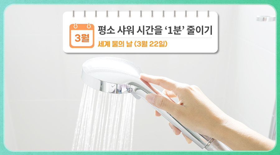 평소 자신의 샤워 시간을 확인하고, 3월에는 평소보다 1분을 줄여보는 것이 어떨까요?